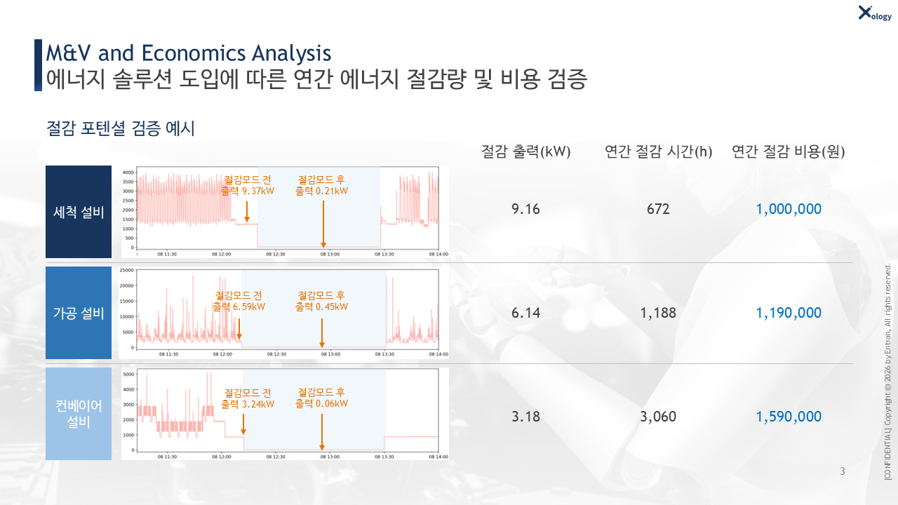 Xology의 분석 엔진은 절감 전후 데이터를 예측/비교해 전력 절감량(ΔkWh/yr), 투자 회수기간(BEP), 내부수익률(IRR) 등 경제성을 자동 산출합니다.