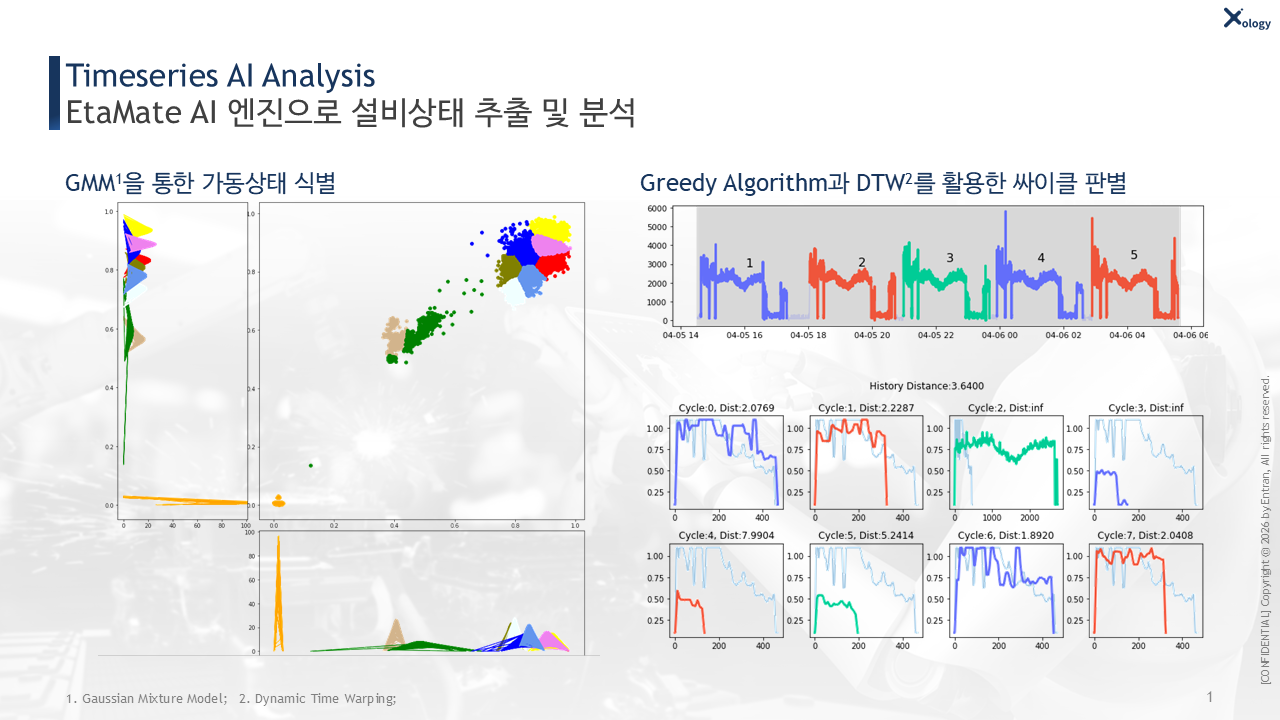Xology의 AI 분석 엔진은 설비별 전력 데이터를 시계열로 학습해 정상운전 상태를 정의하고, 부하 변화, 가동 패턴, 비효율 구간을 자동으로 식별합니다.